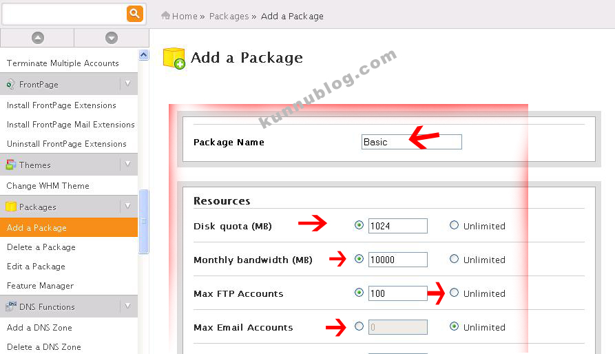 अब पैकेज नेम मे अपने होस्टिंग प्लान का नाम डालें जैसे “Basic” और डिस्क स्पेस(एकाऊंट के लिए हार्ड-डिस्क सपेस) कितना देना है, FTP Account, बैंडविड्थ भरें| अधीकतर होस्टिंग कंपनीयां Disk Space 1GB से 5GB तक अपने बेसीक(basic) पलान मे देते हैं