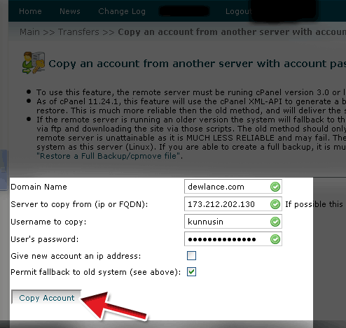 Domain Name: डोमेन नेम जिसको दुसरे सर्वर से खिचना है जैसे( dewlance.com ) Server to copy from (ip or FQDN): दुसरे सर्वर का IP Address डालें जहां से बैकअप खिचना है जैसे (173.212.202.130 ) Username to copy: दुसरे सर्वर से जिस साईट को खिचना है उसका यूजर नेम डालें जैसे( kunnuex )
